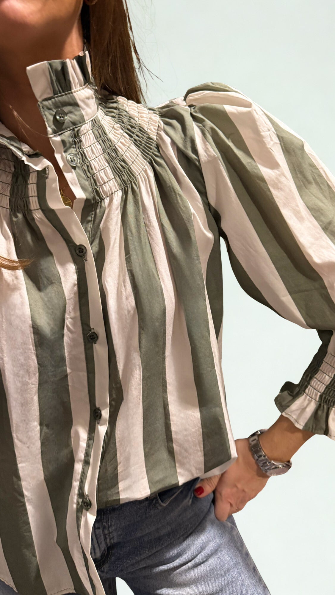 Camisa de rayas verdes con mangas abullonadas. Cuello subido con fruncido nido de abeja en la zona del escote y en los puños. Queda espectacular ❤️