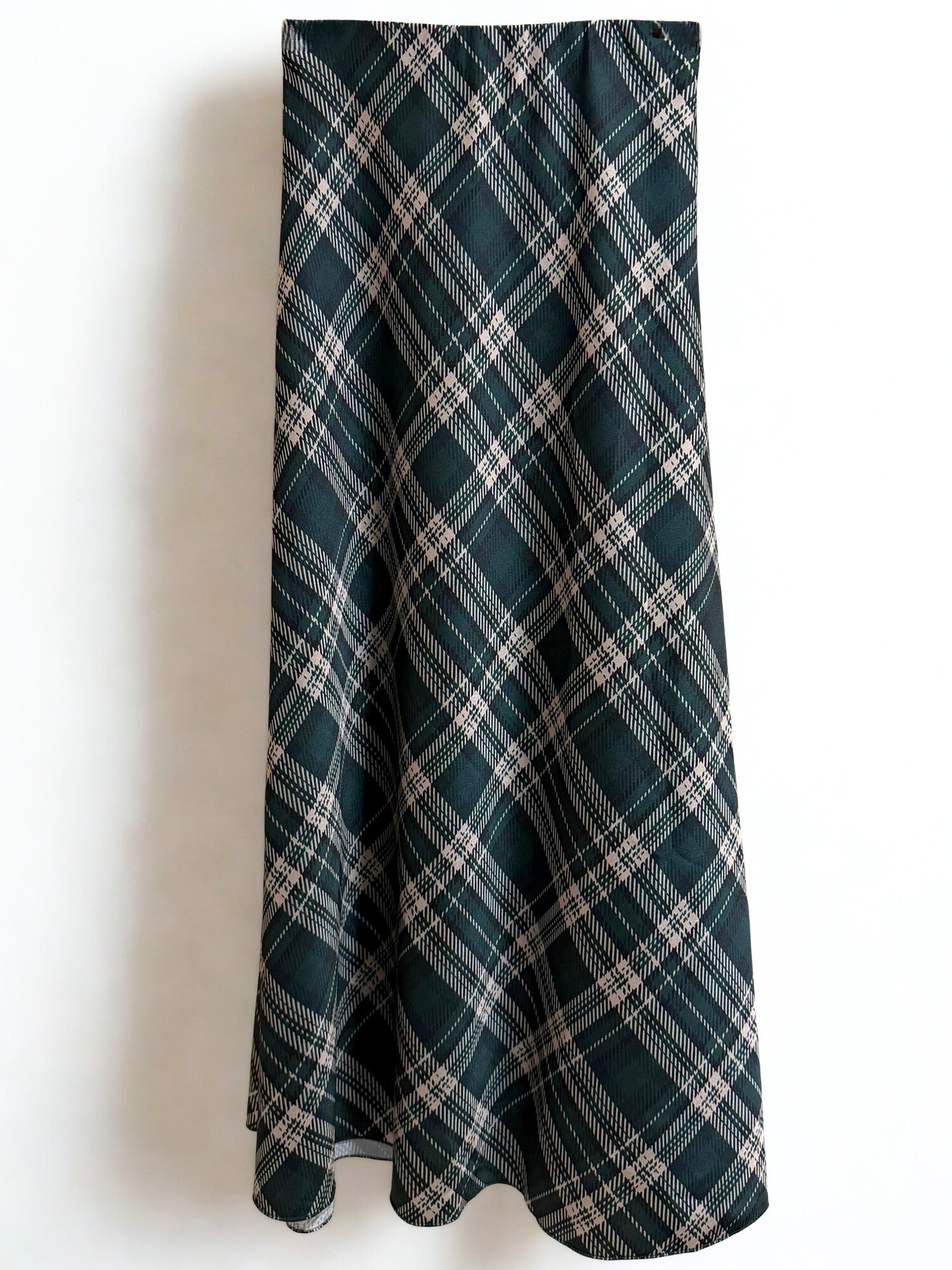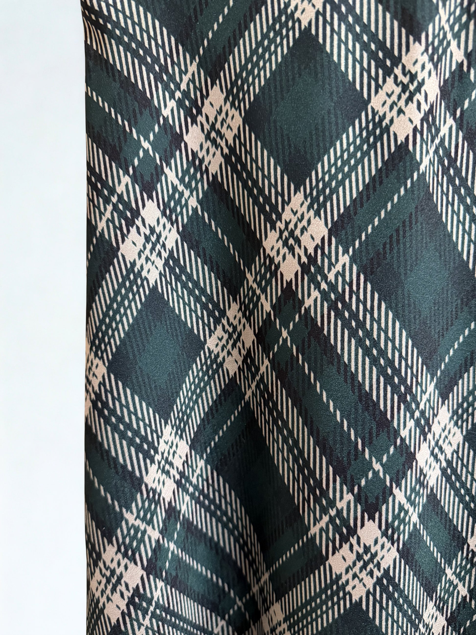FAlda satinada cortada al bies con estampado de cuadros tartán en tonos verdes.