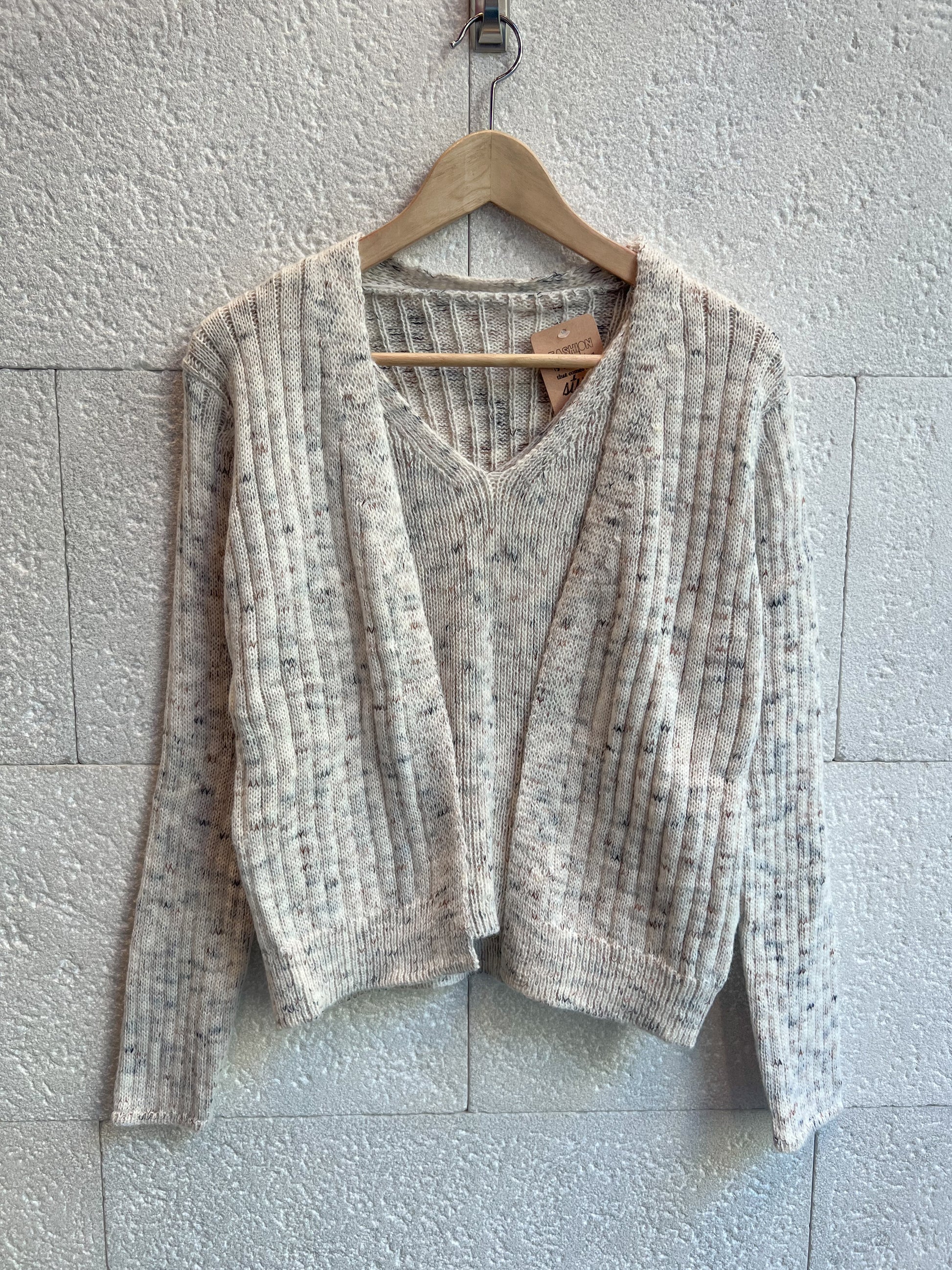 Conjunto Twin Set compuesto por crop top de punto de canalé y chaqueta abierta a juego. El top es de tirantes, cortito y queda ceñido al cuerpo. ¡Es ideal si eres talla “petite”!