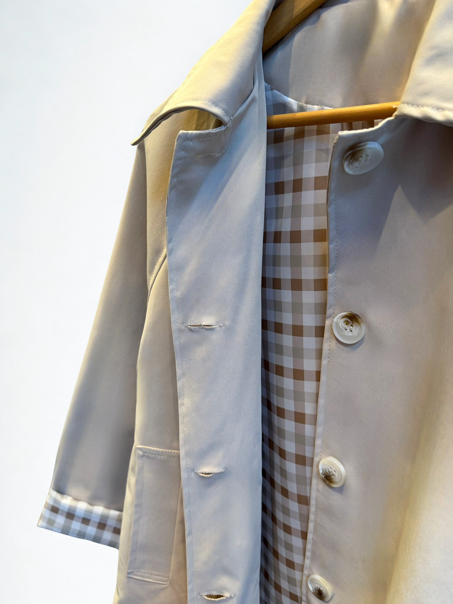 Trench corto con forro de cuadros. Bolsillos laterales. Corte recto. Ideal para tallas S, M y L.