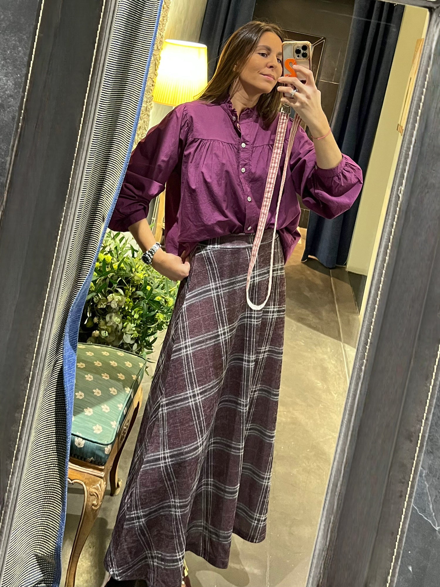 Camisa de algodón corte imperio, forma evasé (da bastante talla). Cuello subido con volantito.