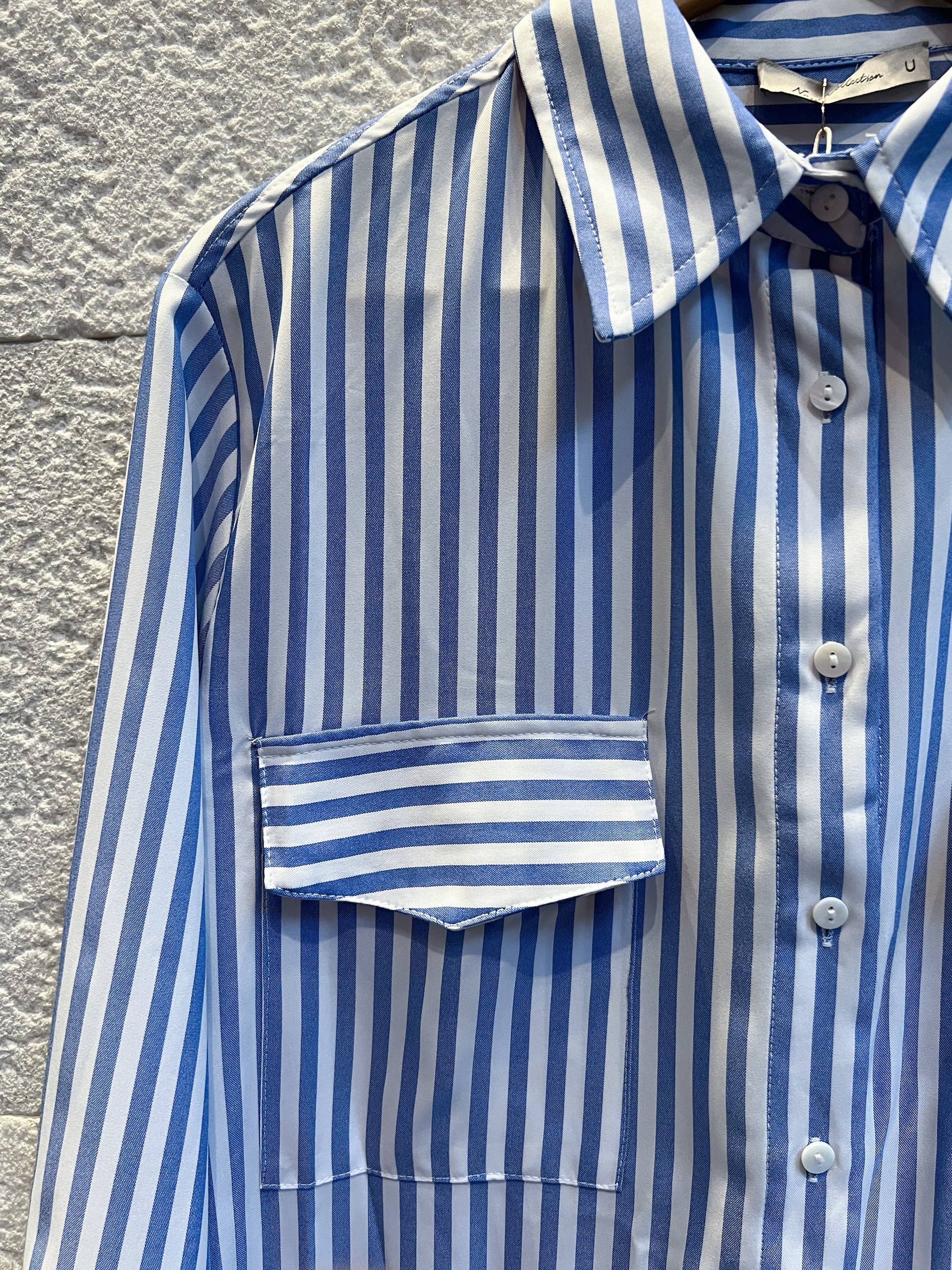 Camisa de rayas azules y blancas con bolsillo en la parte frontal. Larga por debajo de la cadera. Corte recto/oversize.