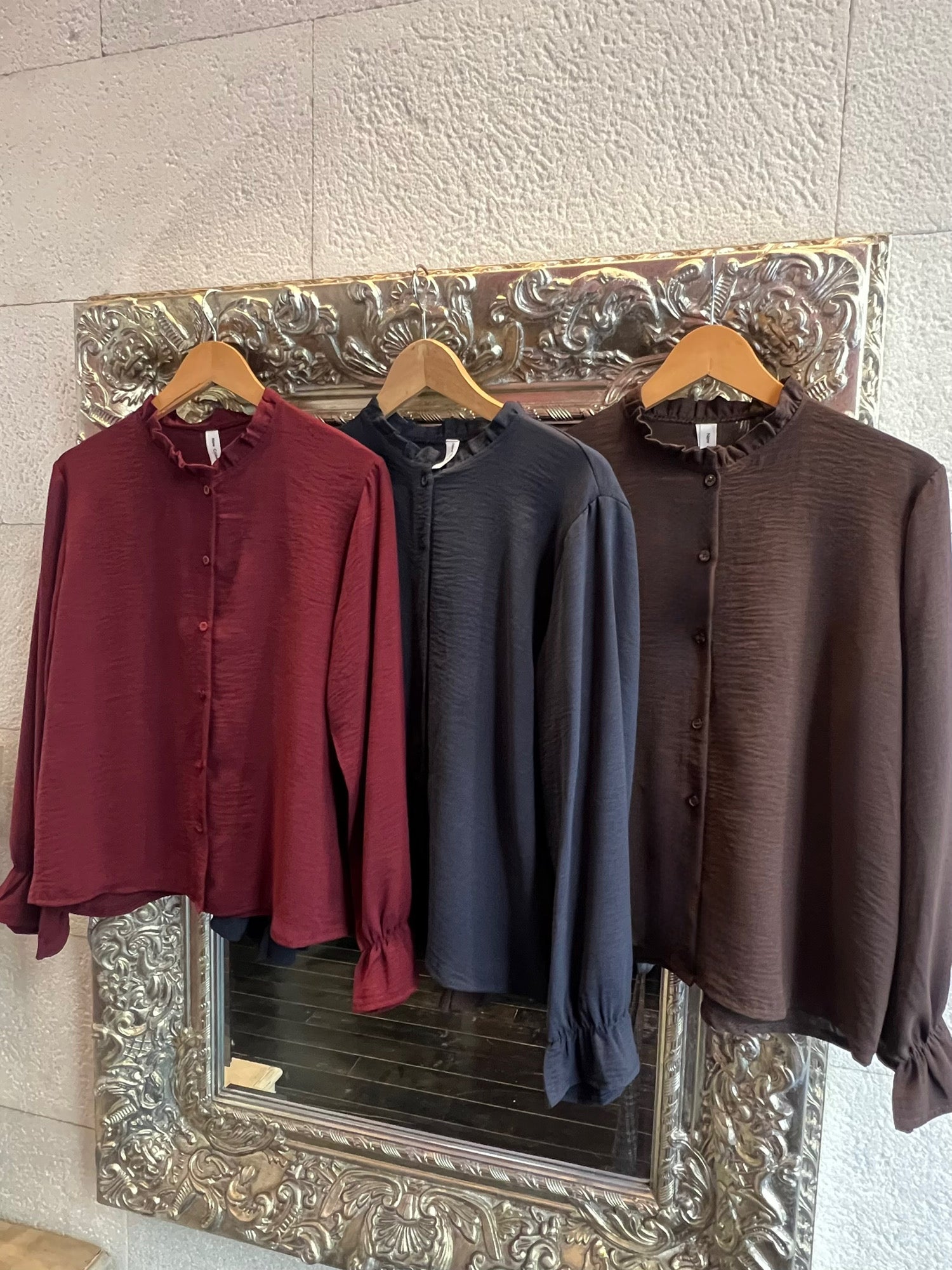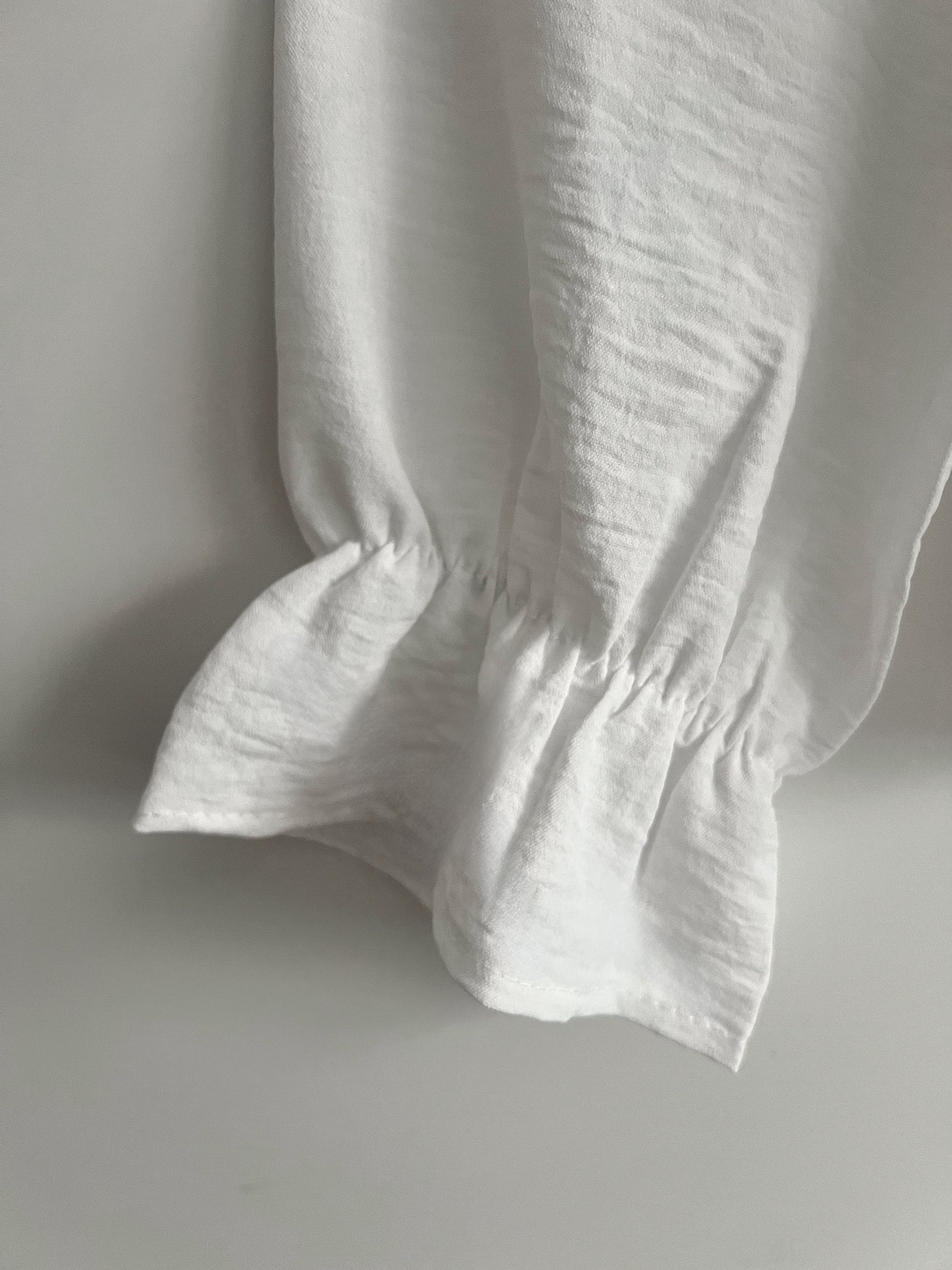 Camisa blanca de crepe con volante en el cuello y fruncido en los puños. ¡Súper versátil y cómoda!