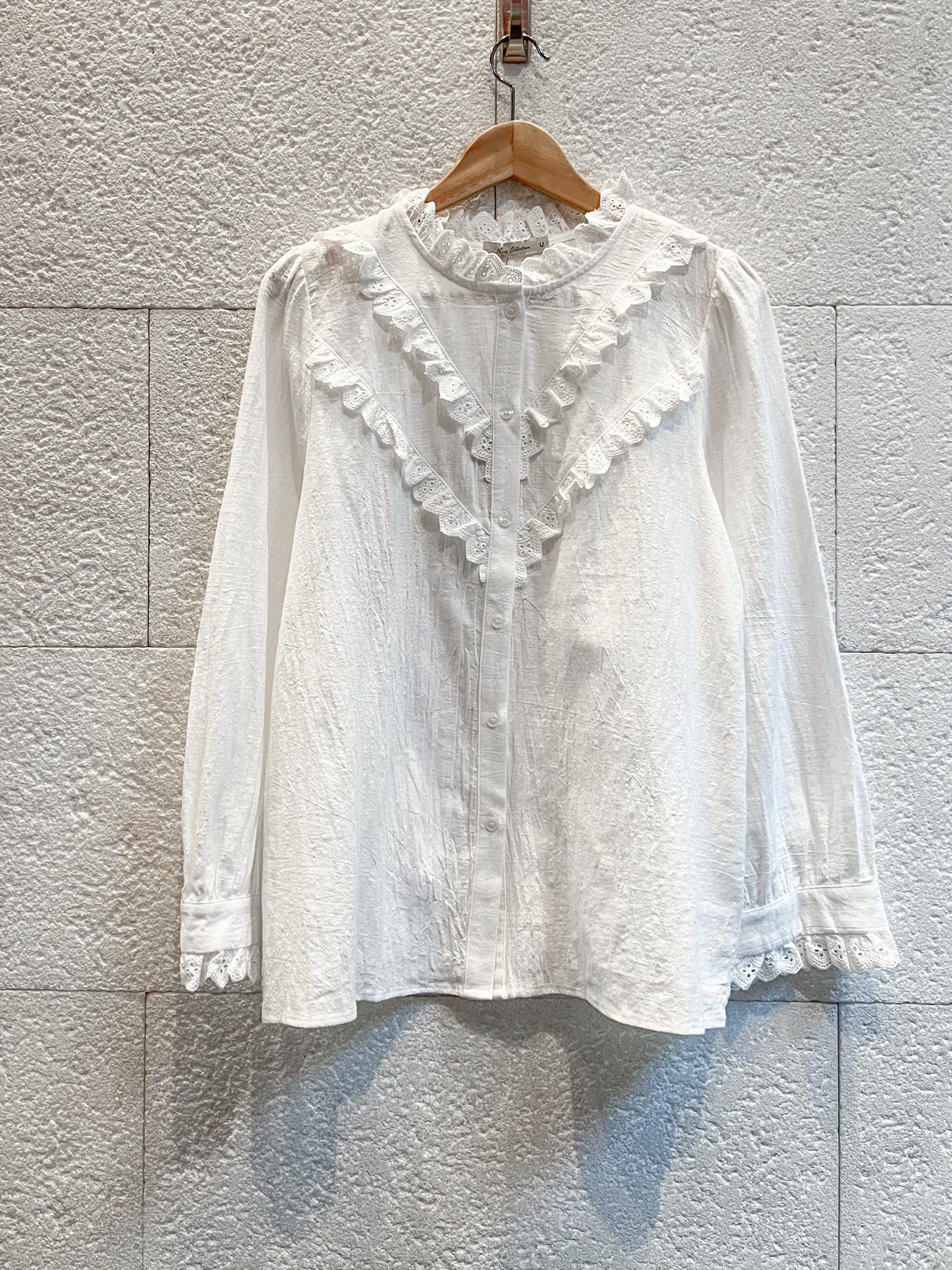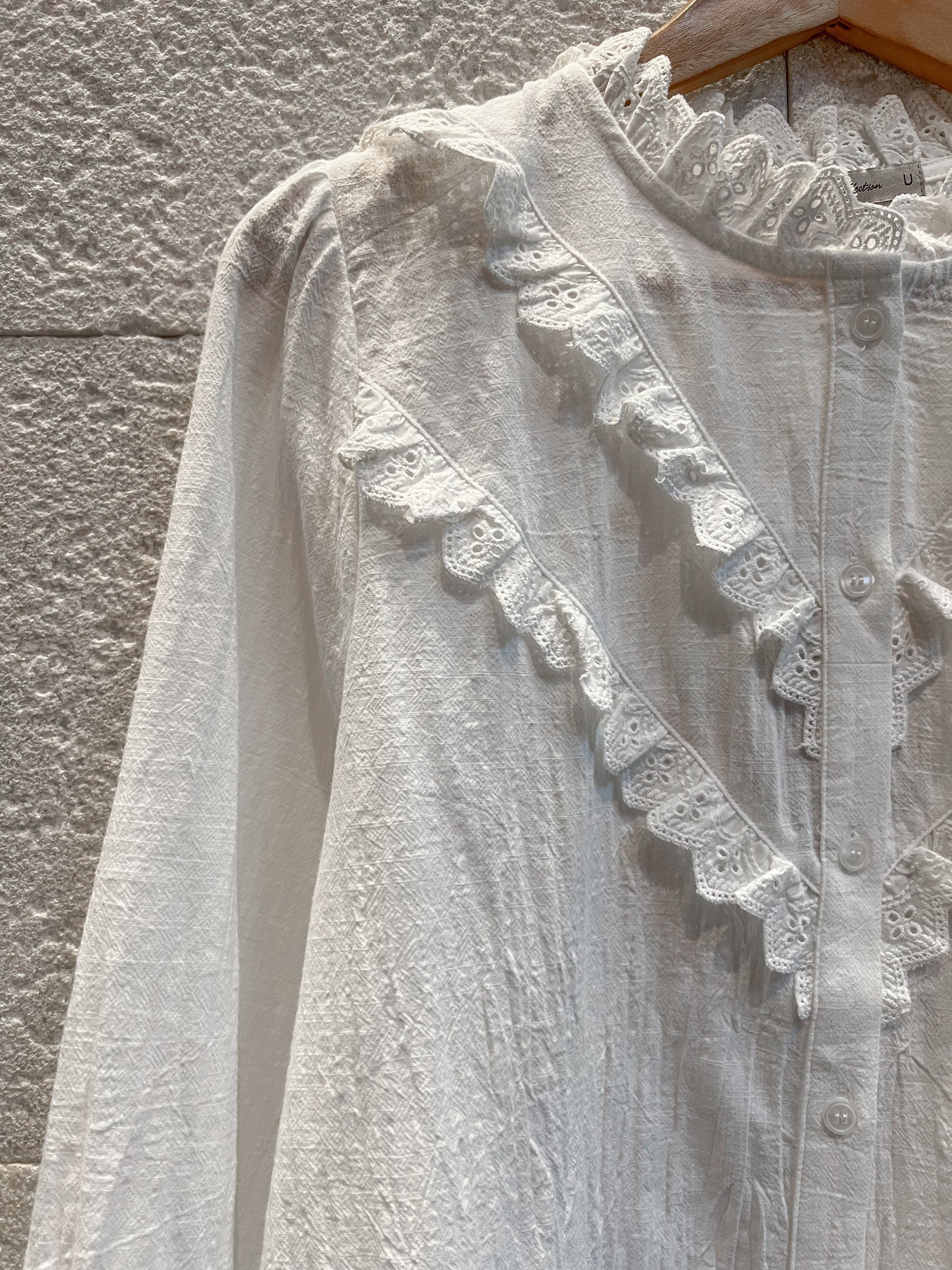 Camisa blanca larga (por debajo de la cadera) con detalle de volantes con bordados suizos.