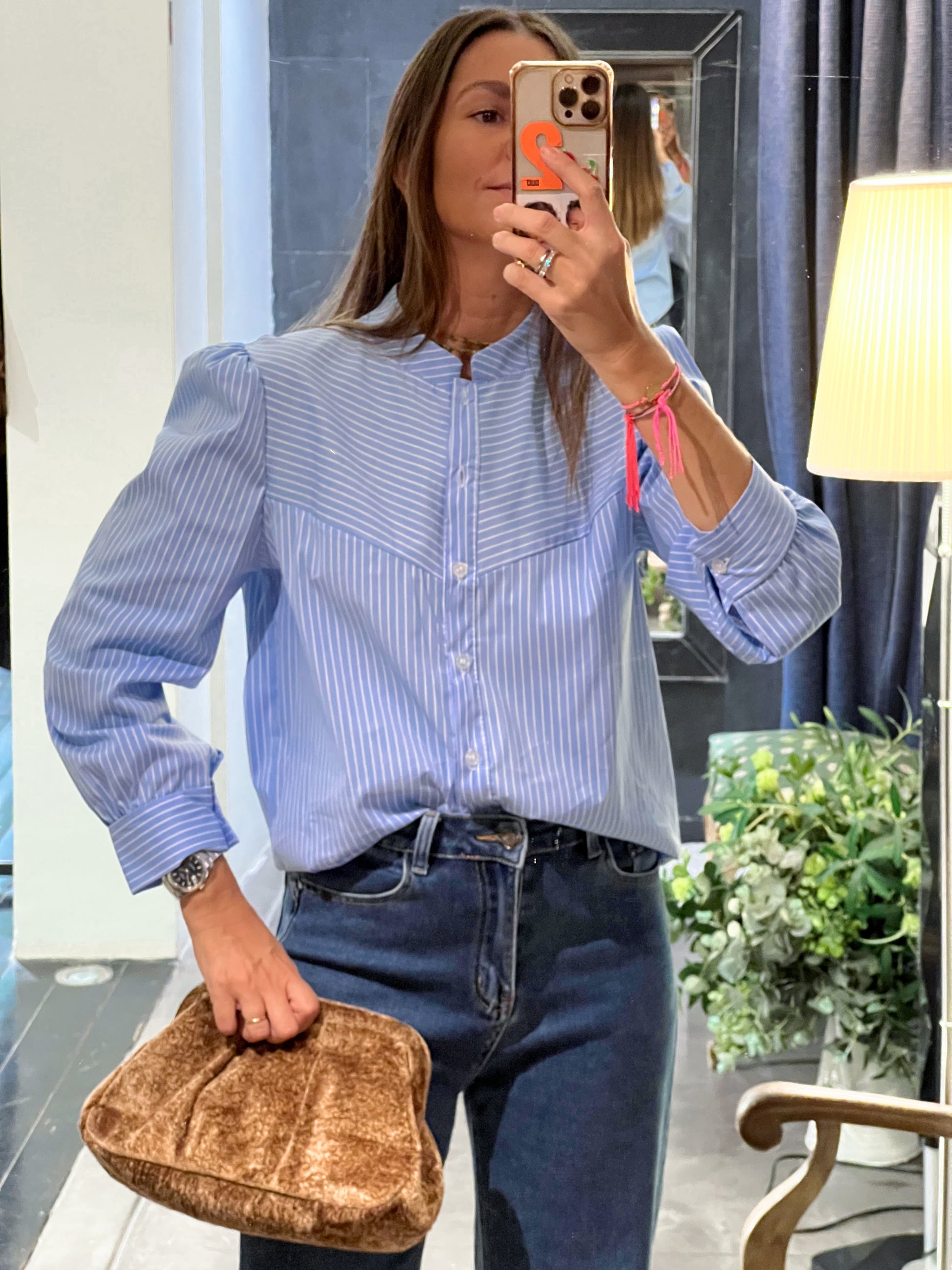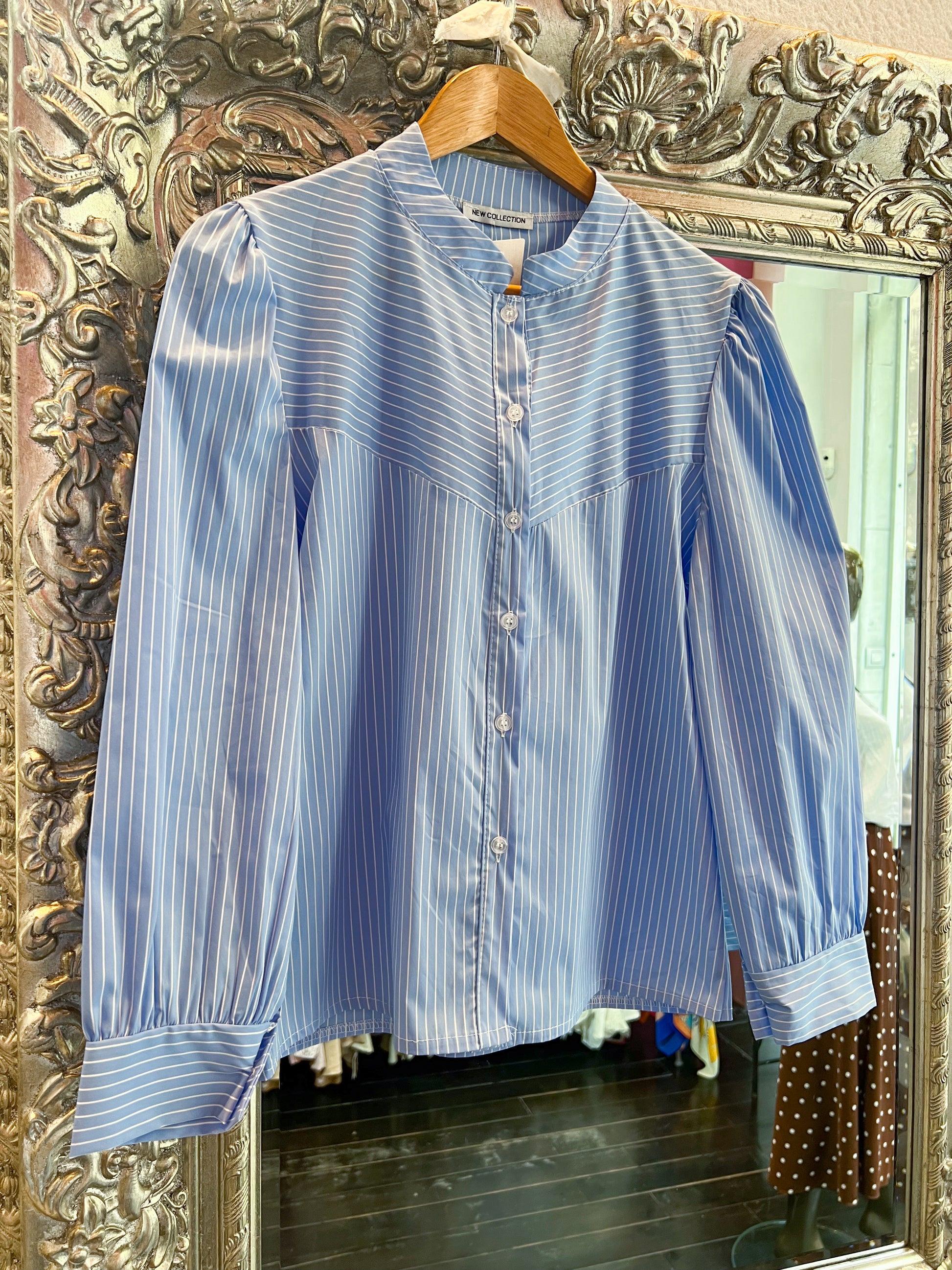 Camisa celeste con rayas blancas. Muy favorecedora y original, gracias a sus mangas con la parte de los hombros abullonada. Le dará un toque de estilo extra a tu look.