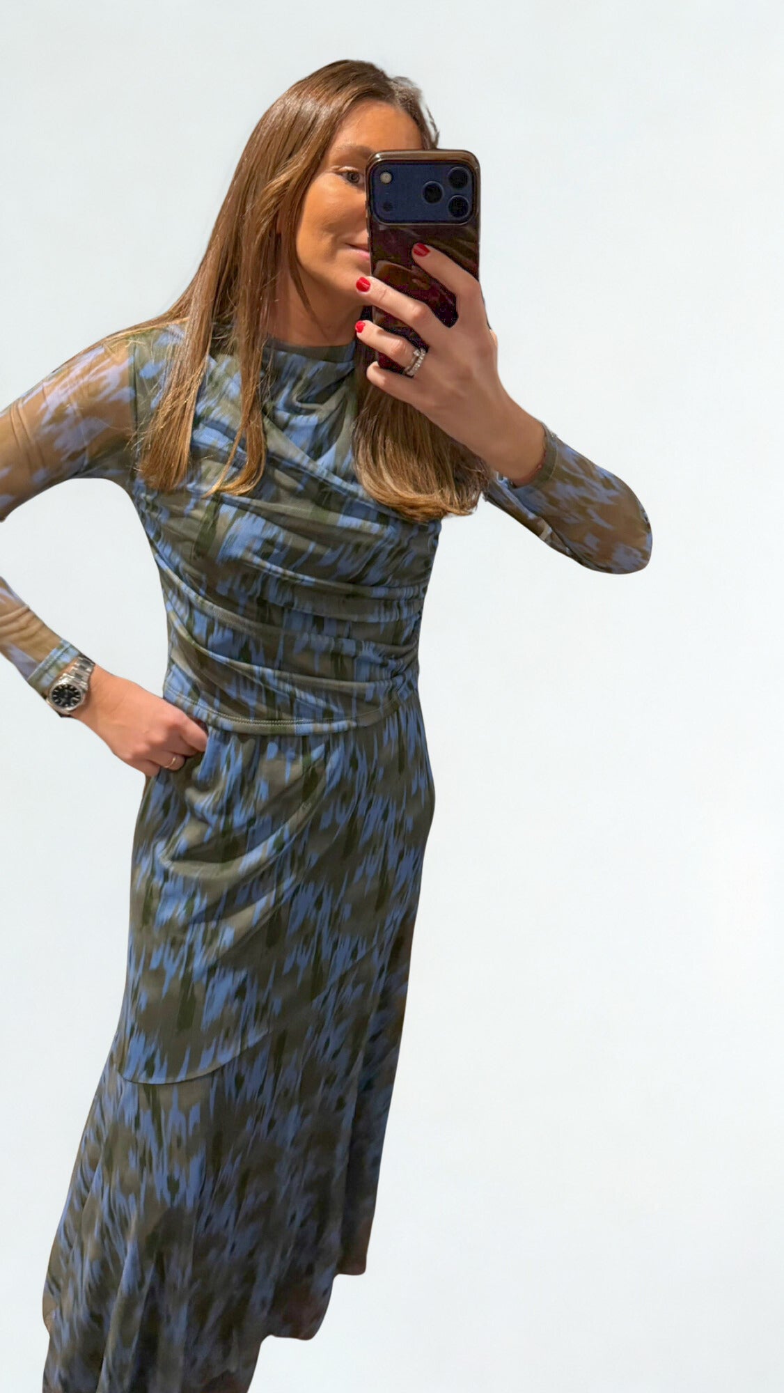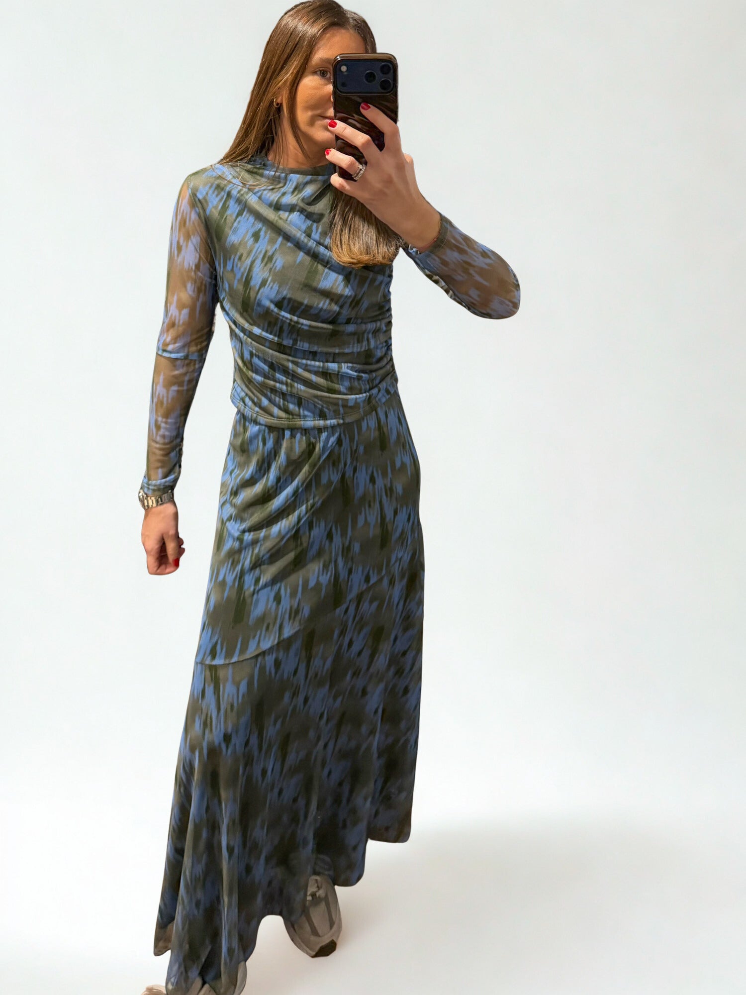 Top y falda de tul (forrados) en estampado verde y azul.