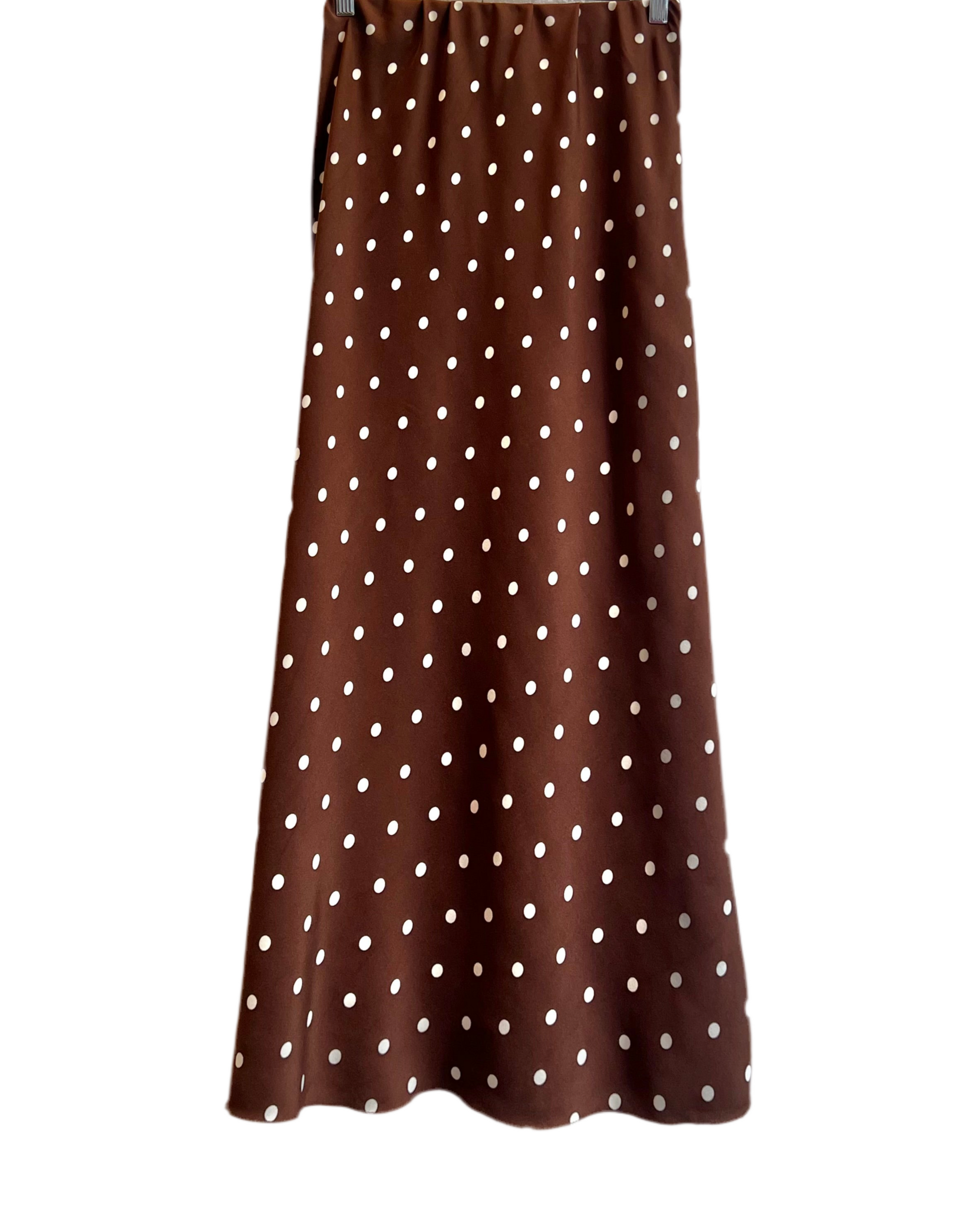 Falda sedosa marrón con lunares blancos. Goma en la cintura, cortada al bies.