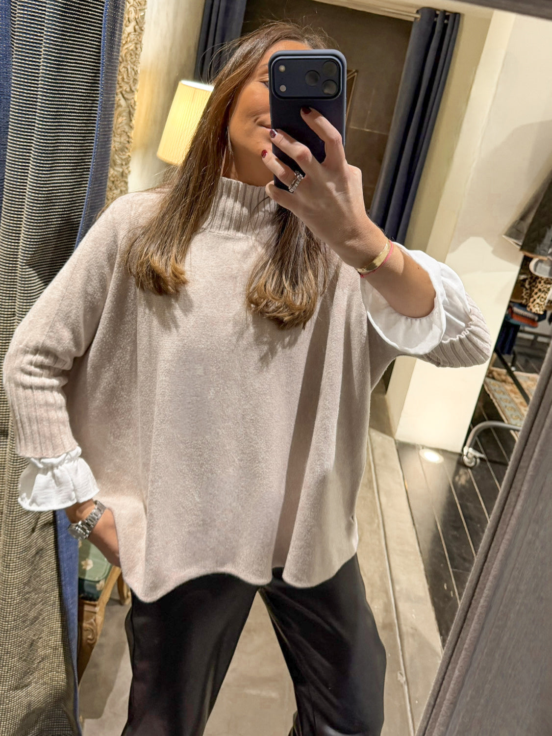 Jersey de corte recto y oversize, mangas 3/4. ¡Súper suave y abrigadito! Ideal si lo combinas encima de tu blusa/camisa favorita, enseñando parte de las mangas.