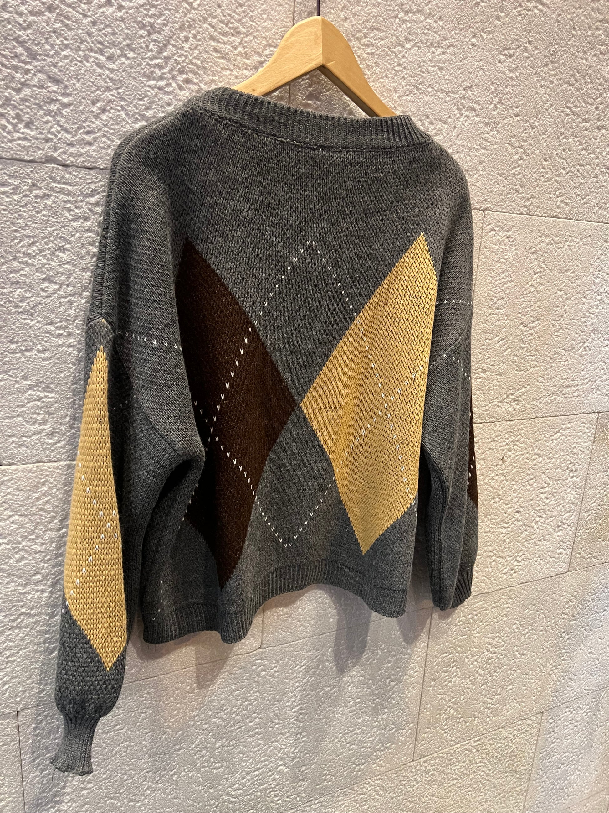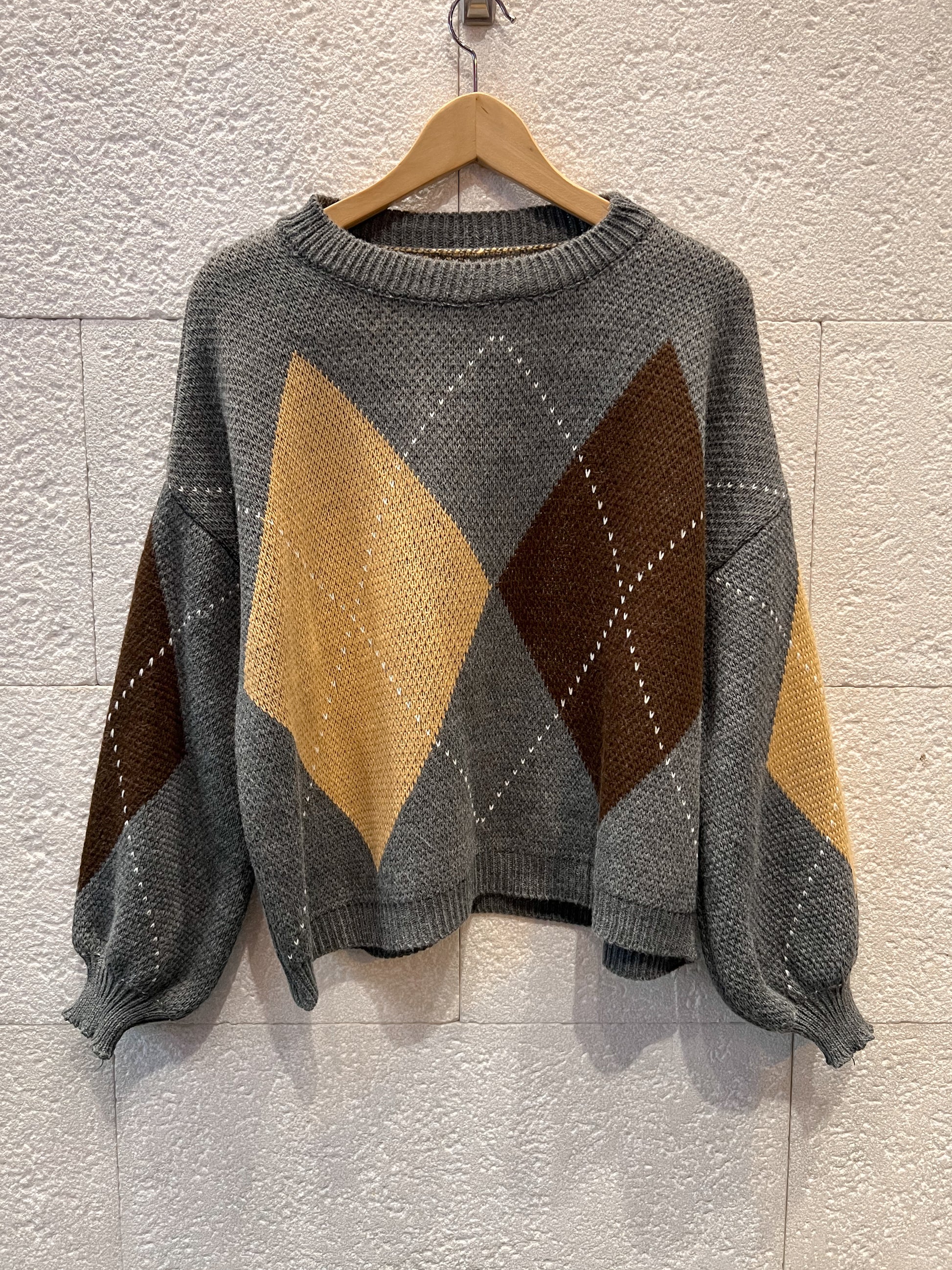 Jersey de rombos oversize cuello redondo con mangas abullonadas. Color gris con rombos en tonos chocolate y camel. Súper suave (no pica) y calentito!