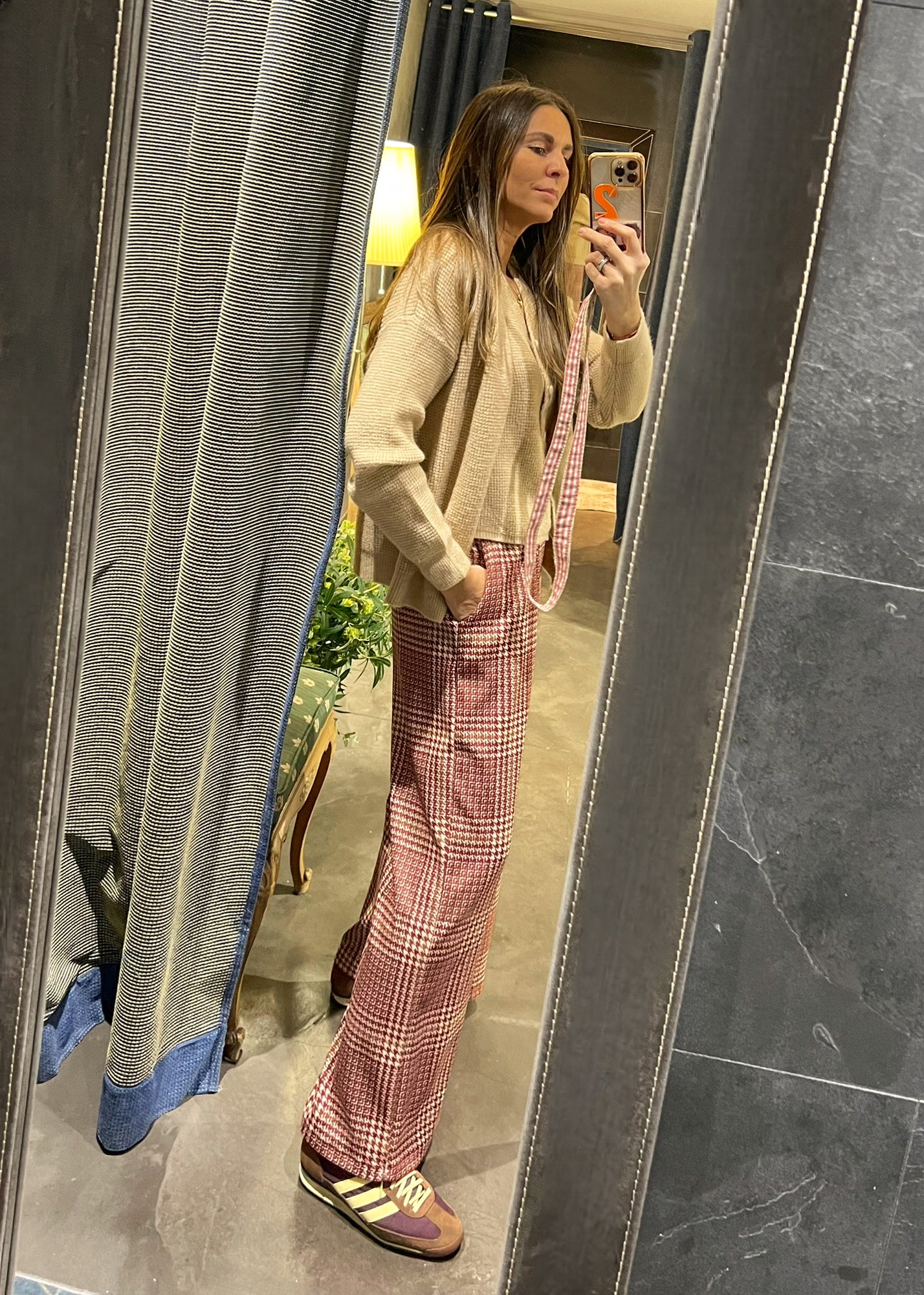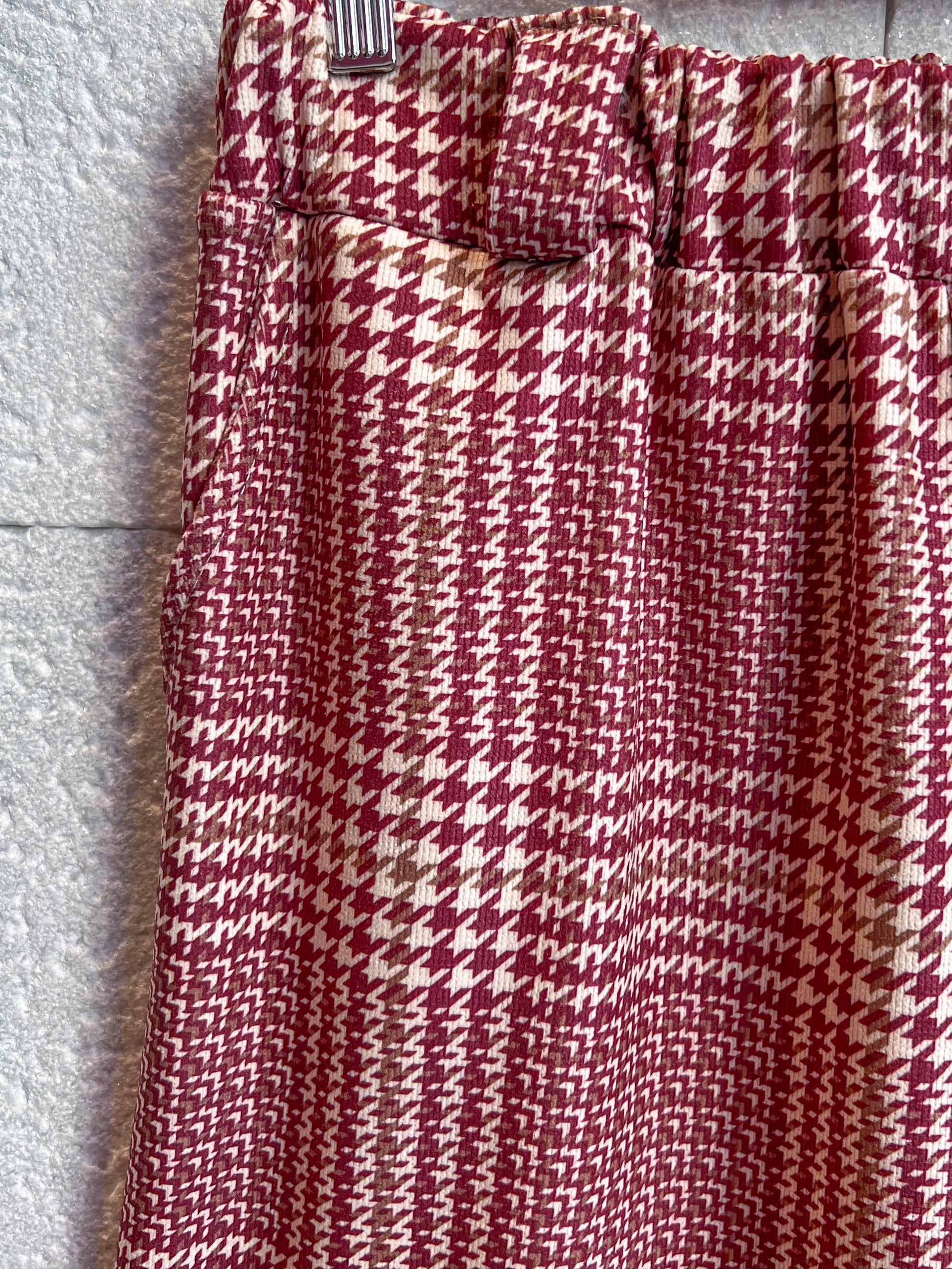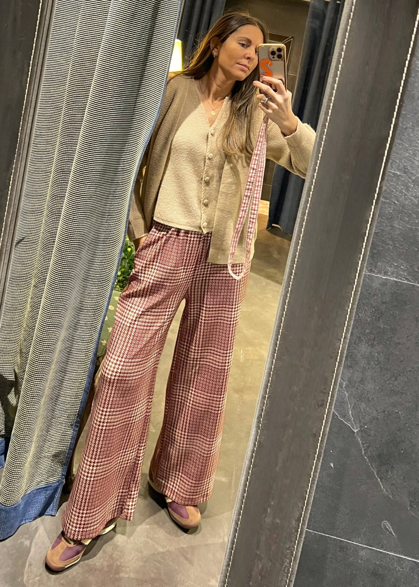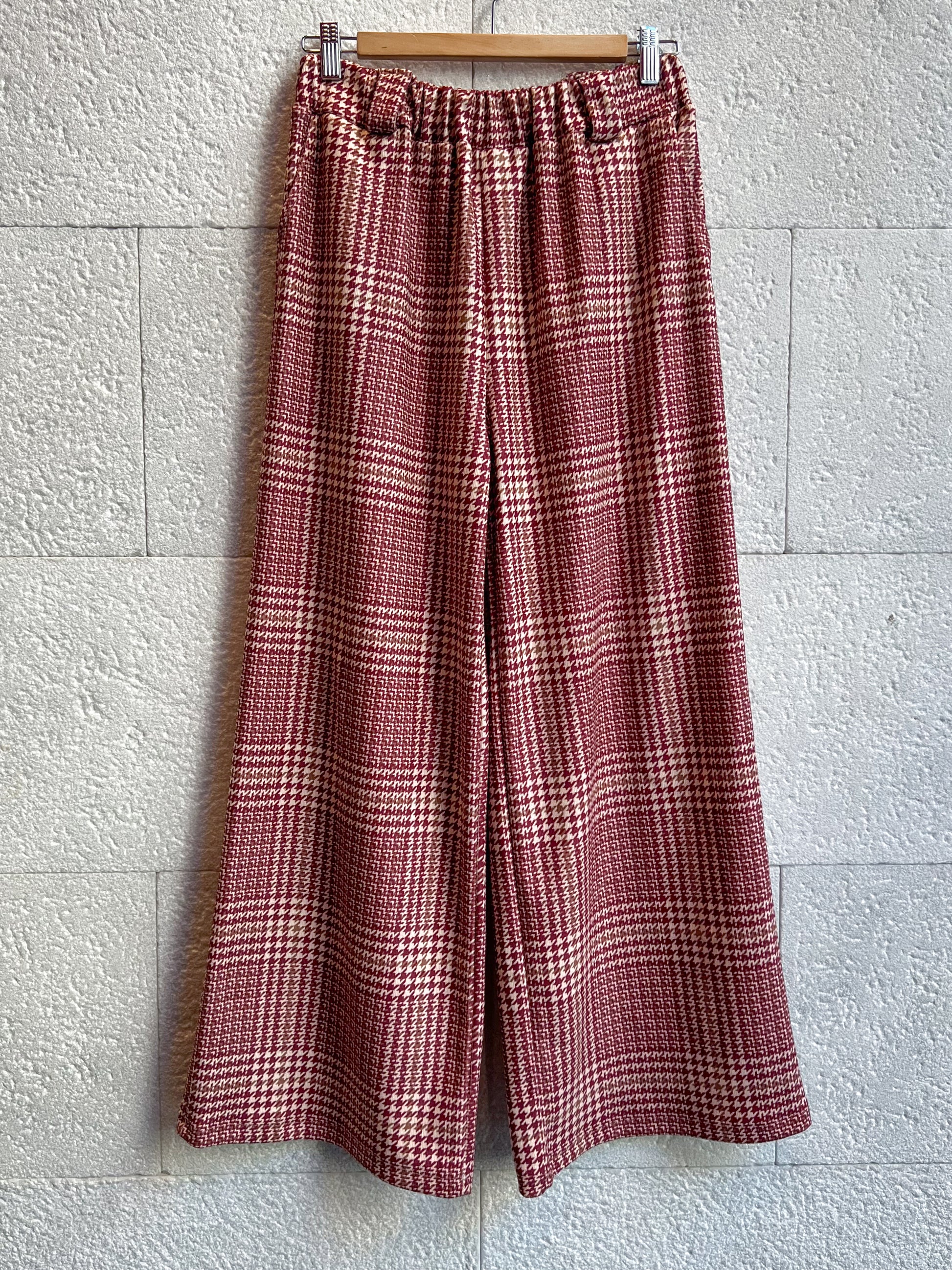 Pantalón palazzo con goma en la cintura y bolsillos laterales. Tejido aterciopelado ¡súper suaves, cómodos y calentitos! Estampado de cuadros en tonos cereza y camel.