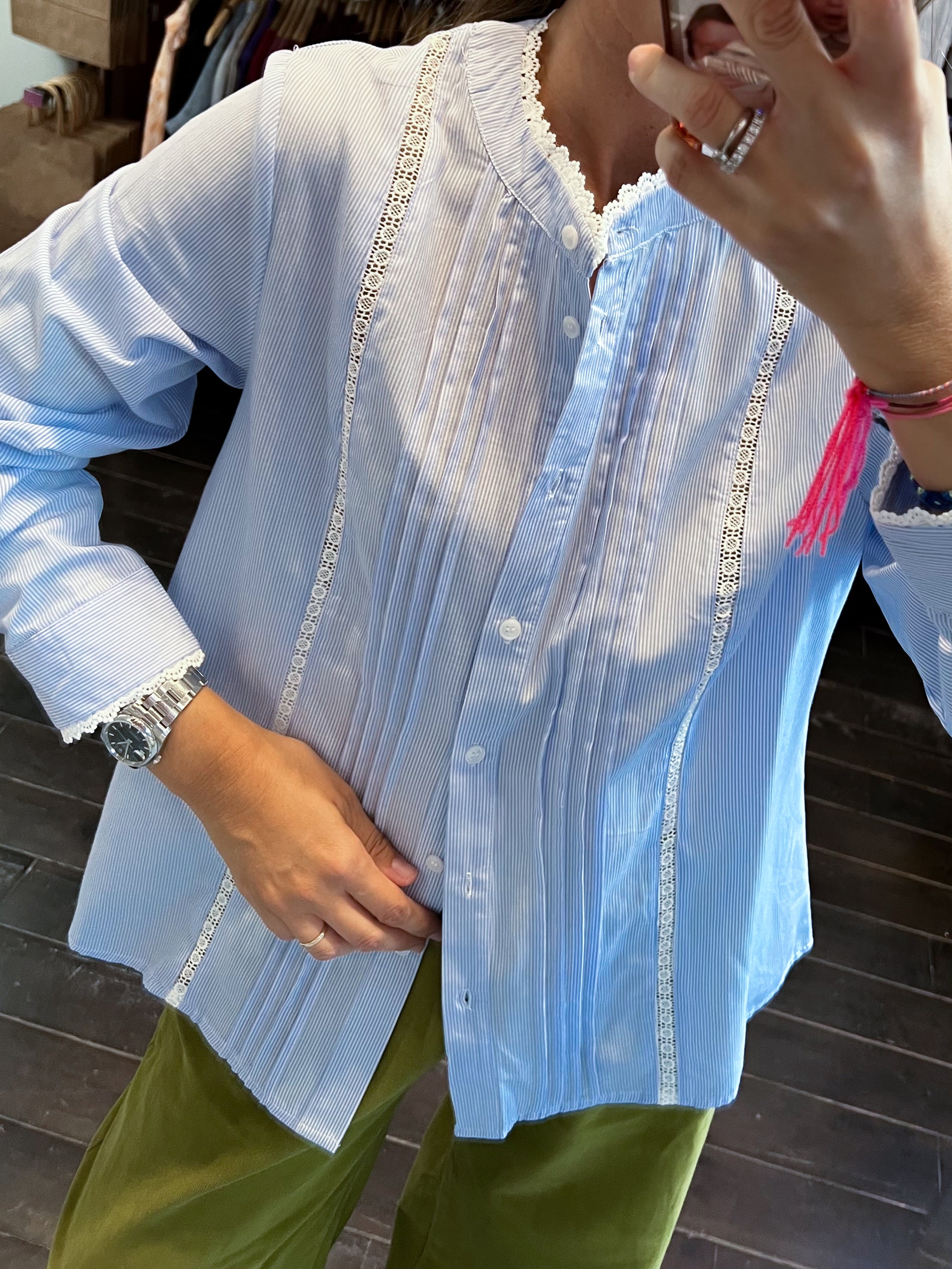 Camisa de rayas azules y blancas con detalle de pasamanería bordada blanca en puños, cuello y parte frontal.
