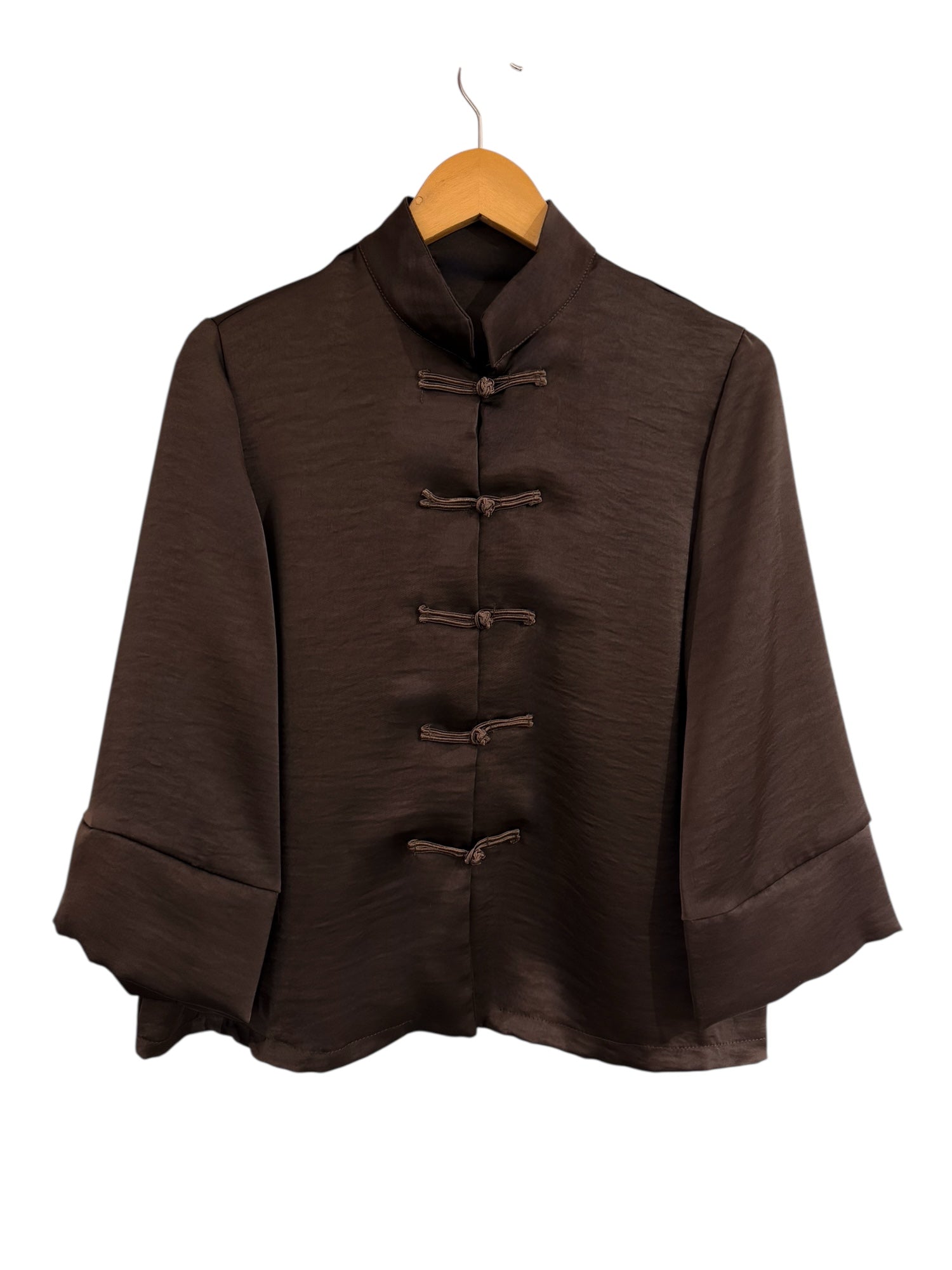 Camisa/sobrecamisa manga 3/4 de tejido satinado con botonadura estilo oriental, ¡súper tendencia! Corte evasé. Consejo: Combínala con un top del mismo tono debajo, nosotras hemos apostado por nuestro top lencero en marrón chocolate 🤎