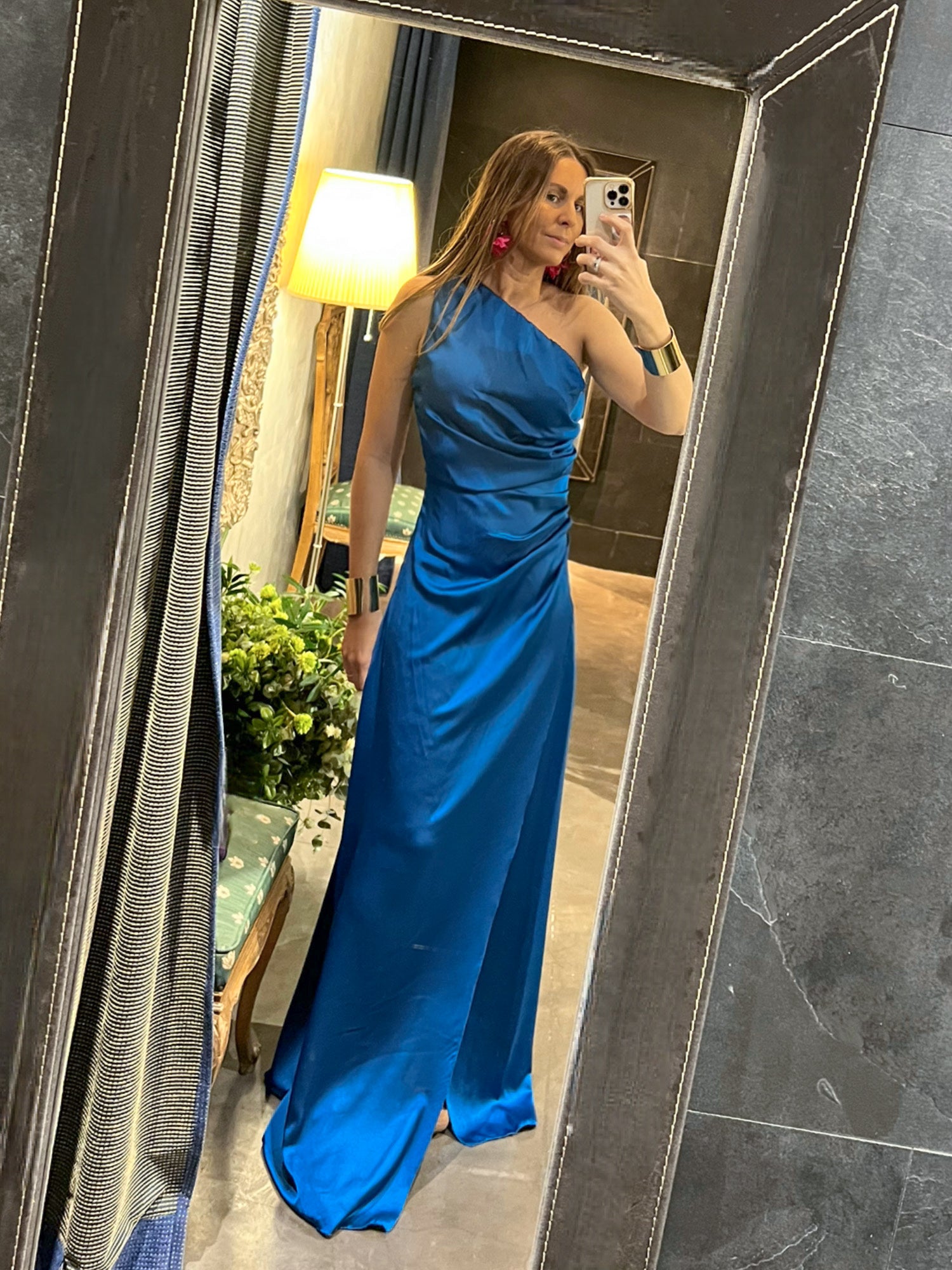 Vestido largo de fiesta con un hombro descubierto. Nos encanta su caída y su efecto drapeado. Tejido efecto seda. Cierre mediante cremallera lateral. Incluye copas en la zona del pecho.